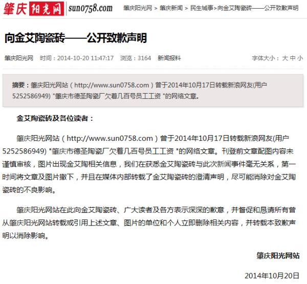 肇慶陽光網(wǎng)向金艾陶瓷磚——公開致歉聲明