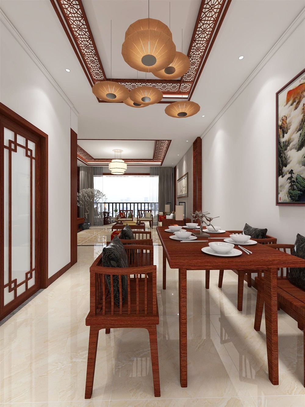 開放式的餐廳與客廳相連通,中間的走廊讓客廳、餐廳區(qū)域分明,餐廳矩形餐桌和復(fù)古的吊燈組合,天花是簡單的雕花,留住了中式韻味注入了新中式的創(chuàng)新元素。