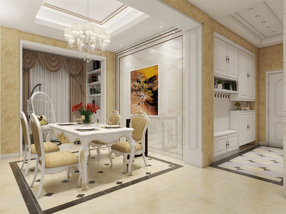 大面積鋪貼的白色背景墻優(yōu)雅脫俗,抽象的掛畫增添了幾分意境,深褐色的原木餐桌線條簡練,與天花相互呼應(yīng),讓現(xiàn)代家居裝飾更具中國文化韻味。