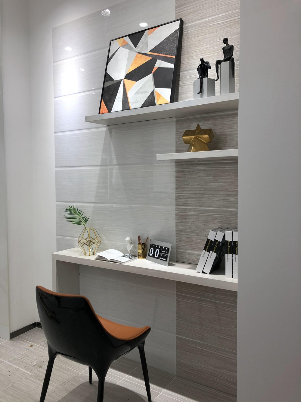這是由噴墨瓷片鋪貼的書(shū)房墻面,亮面磚易于打理,磚面線條簡(jiǎn)潔舒適。