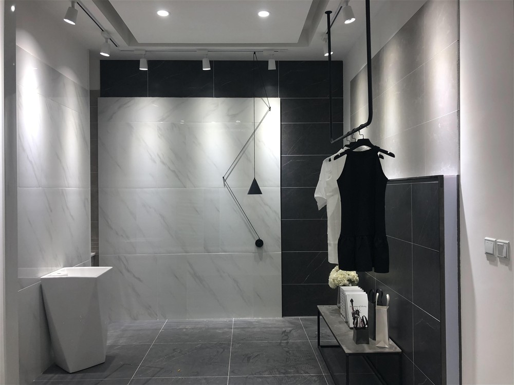 這是灰色調(diào)的衛(wèi)生間模擬間,瓷磚選用通體大理石亮面磚,上墻下地都能鋪,現(xiàn)代簡(jiǎn)約風(fēng)和輕奢風(fēng)都十分適用。