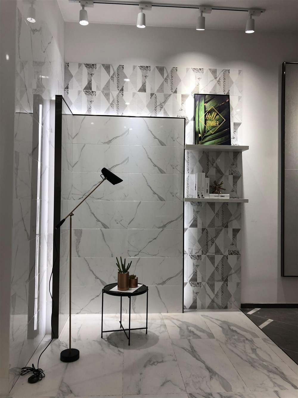 這是吧臺(tái)模擬間,由九面通體大理石和緞光釉不同規(guī)格、產(chǎn)品、顏色鋪貼的墻面,個(gè)性、時(shí)尚,搭配大理石吧臺(tái)和金屬軟裝,營(yíng)造出輕奢的質(zhì)感。
