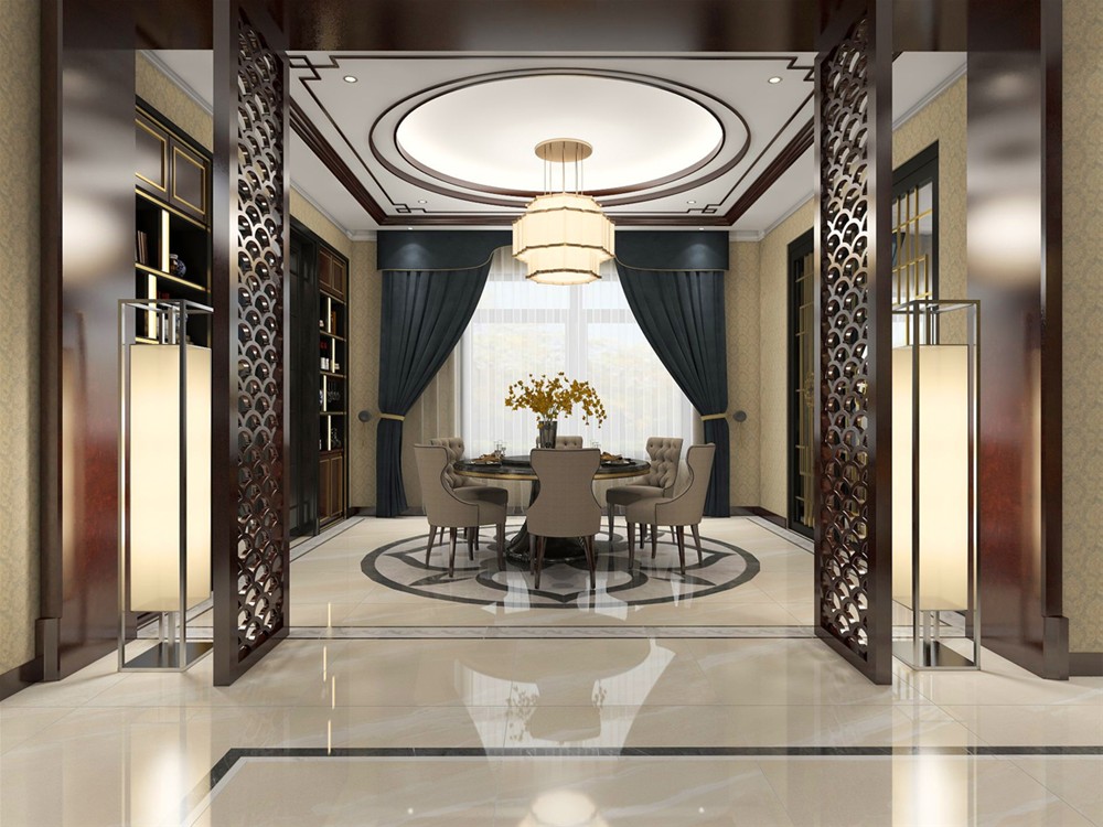 餐廳作為和客廳貫通的空間,利用相協(xié)調(diào)的深木色酒柜為整墻背景,選擇富有中式格調(diào)的地磚拼花,象形荷花圖案,整體空間呈現(xiàn)素雅而明媚,傳統(tǒng)而不失現(xiàn)代,慢慢生出了整個空間的“魂”。讓人覺得在此用餐是為樂事!