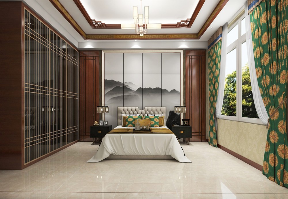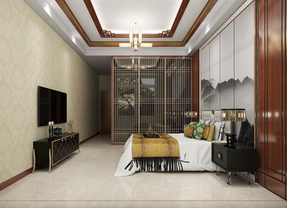 主臥床背景仍利用木色為主構(gòu)架融會貫通,再加以富有意境的山水壁畫作為更深層的點(diǎn)綴,讓人們在整個空間里感受傳統(tǒng)文化帶來的熏陶與動感,生命也變得溫潤充盈,富有韻味。