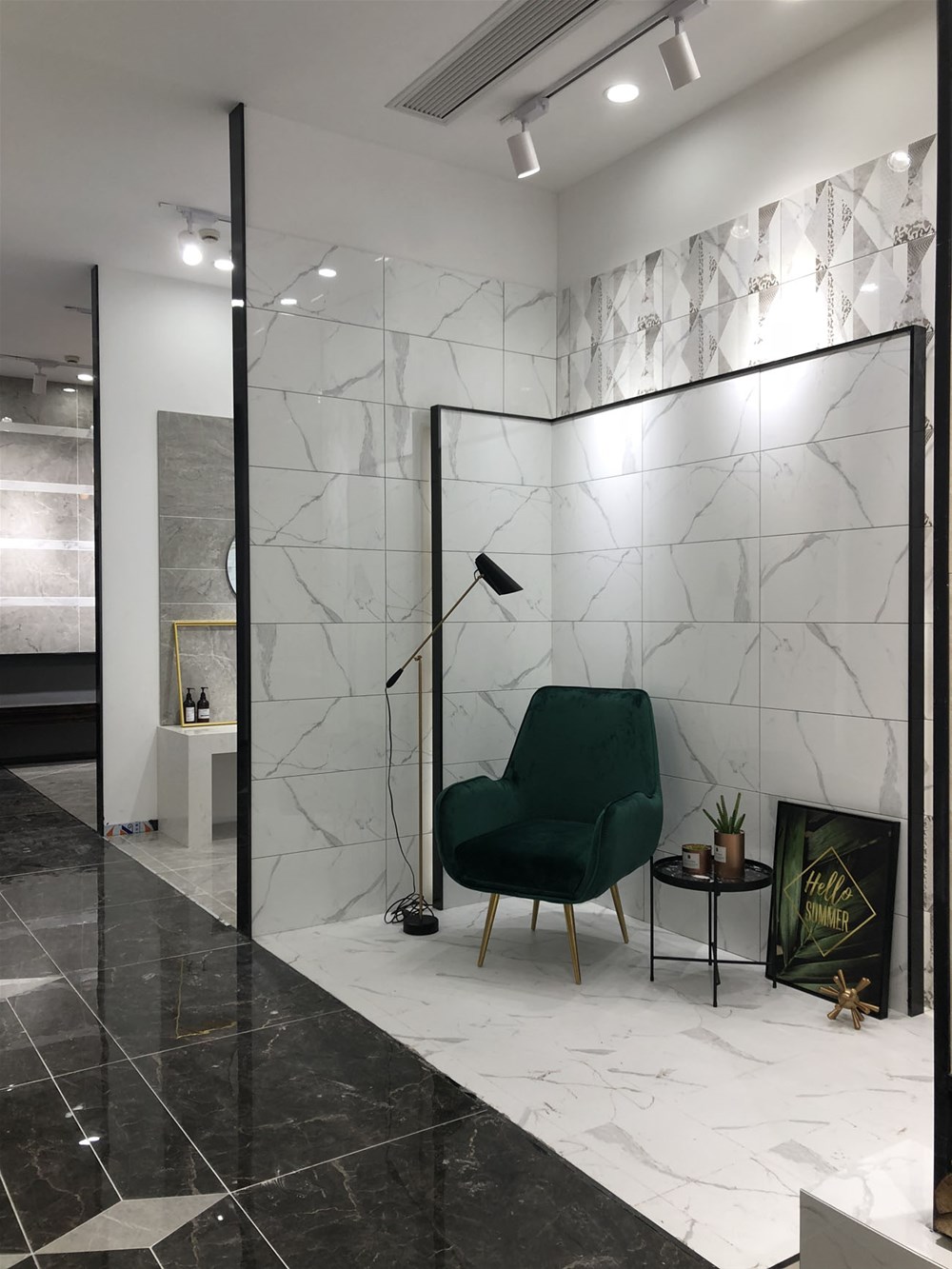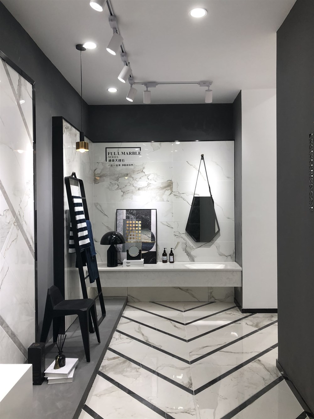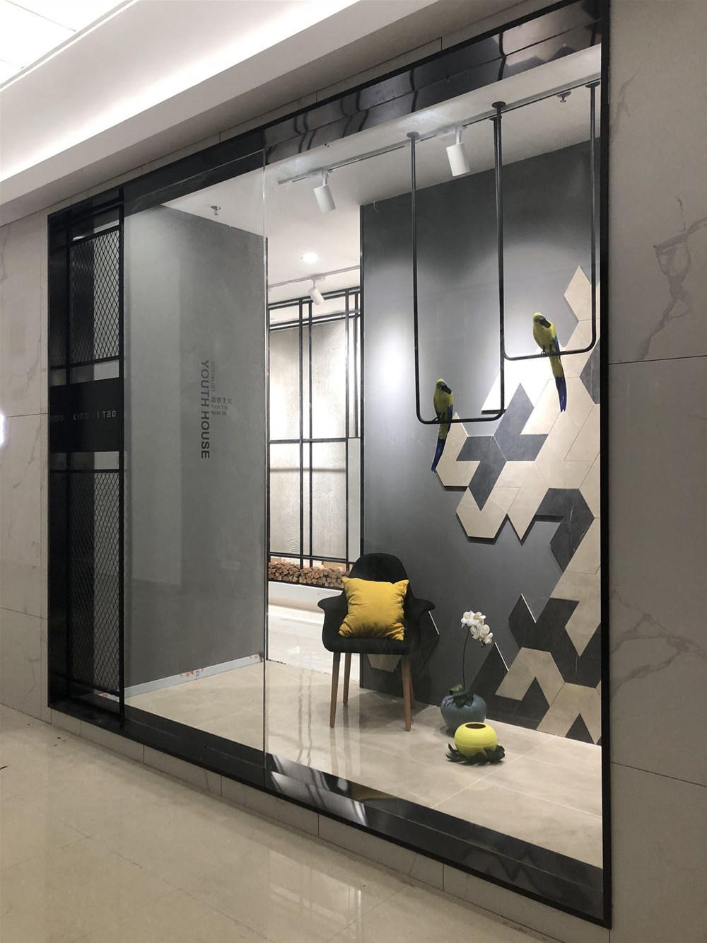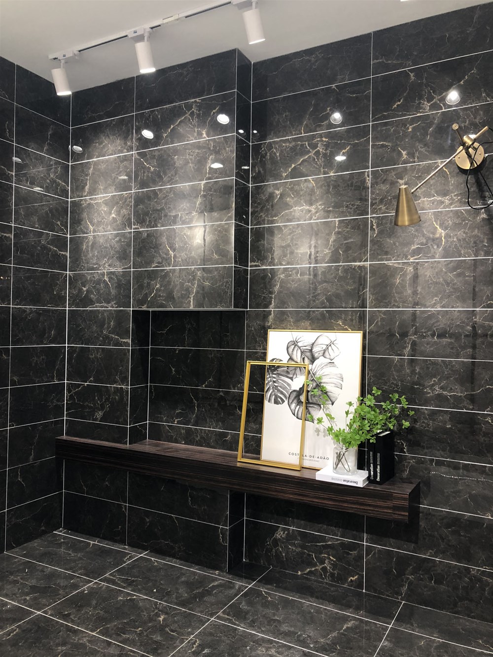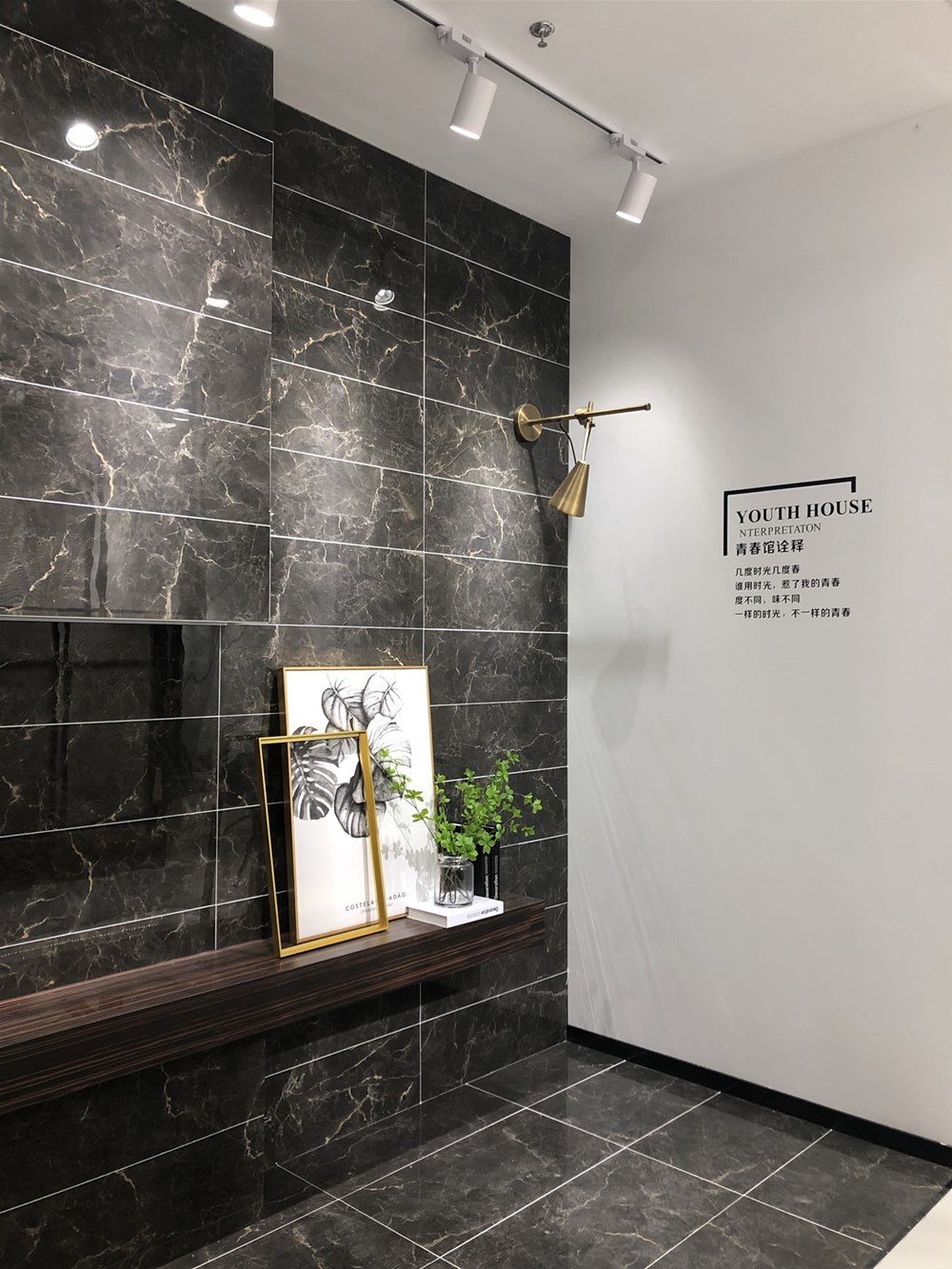 這是輕奢風(fēng)格陽(yáng)臺(tái)、書房的模擬間,由噴墨瓷片鋪貼的墻面?zhèn)€性時(shí)尚,搭配金屬軟裝營(yíng)造出輕奢的質(zhì)感?,F(xiàn)在很多流行的咖啡廳參照這樣的設(shè)計(jì)來(lái)吸引消費(fèi)者。