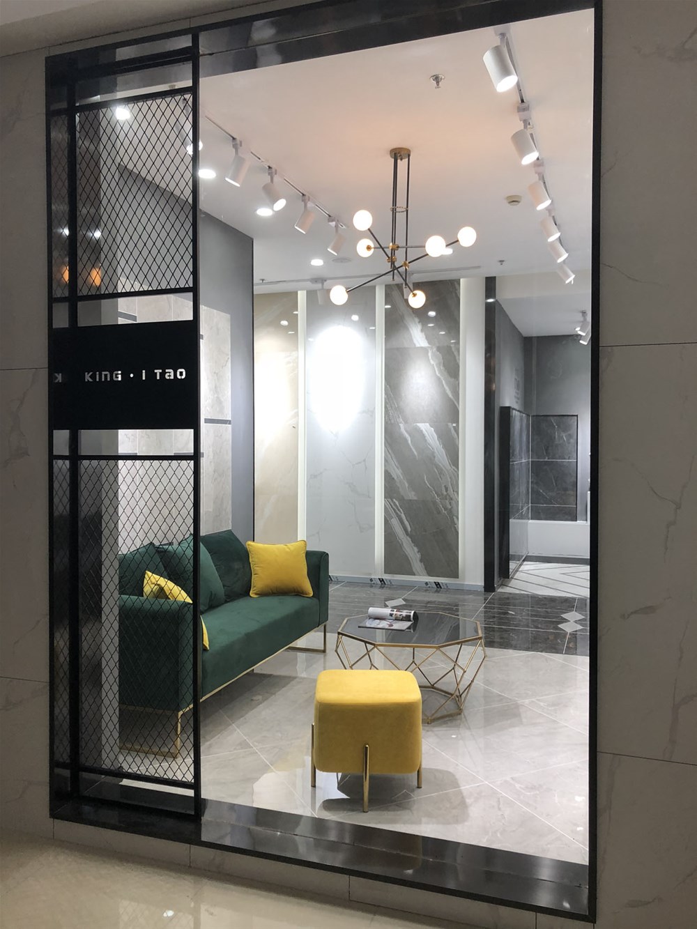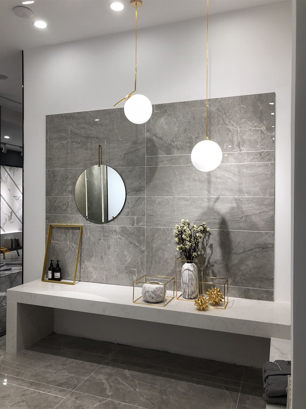 這是金艾陶浙江湖州青春館的形象臺(tái)和形象墻,上圖由灰色九面通體大理石鋪貼的前臺(tái)背景墻,可作電視背景墻和客廳地磚鋪貼使用。