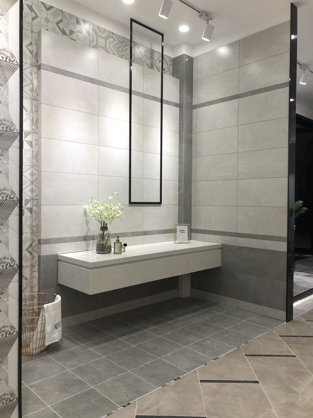 這是由噴墨瓷片鋪貼的現(xiàn)代簡(jiǎn)約衛(wèi)生間,簡(jiǎn)單的鋪貼方式?jīng)]有過(guò)多的造型,一深一淺搭配出層次感,花片恰到好處的使用,簡(jiǎn)約而不簡(jiǎn)單。