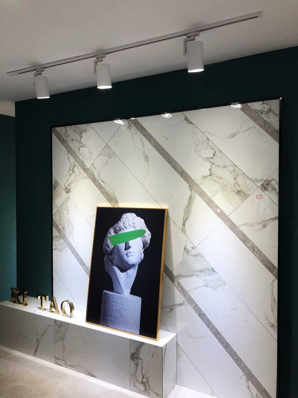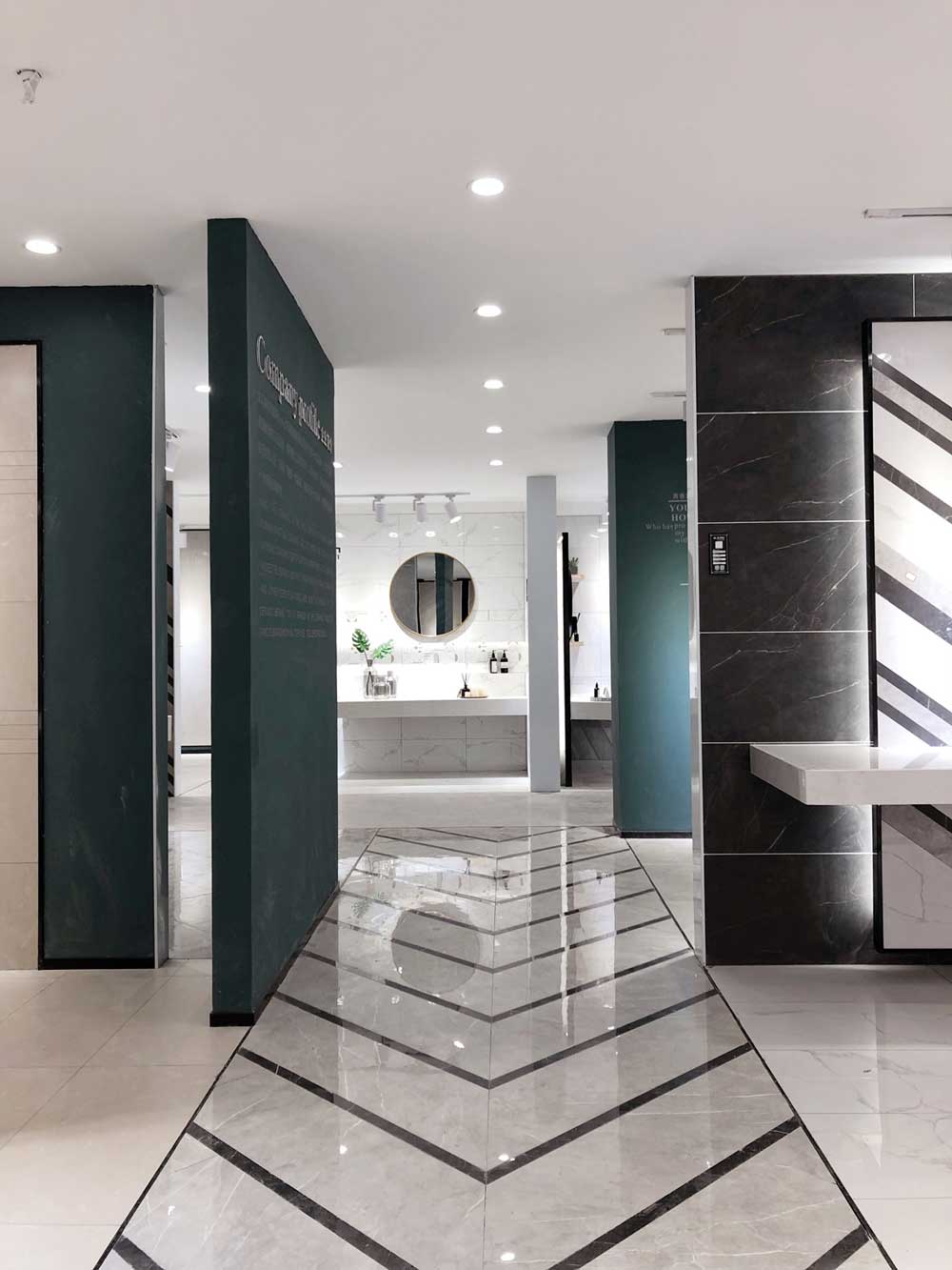 這里是我們店800x800規(guī)格產(chǎn)品的選材區(qū),通過射燈的照射下產(chǎn)品紋理是不是清晰多了?選材區(qū)過道選用淺色磚是為了區(qū)分產(chǎn)品,不至于喧賓奪主。家里裝修也要考慮好顏色搭配和空間主次哦。