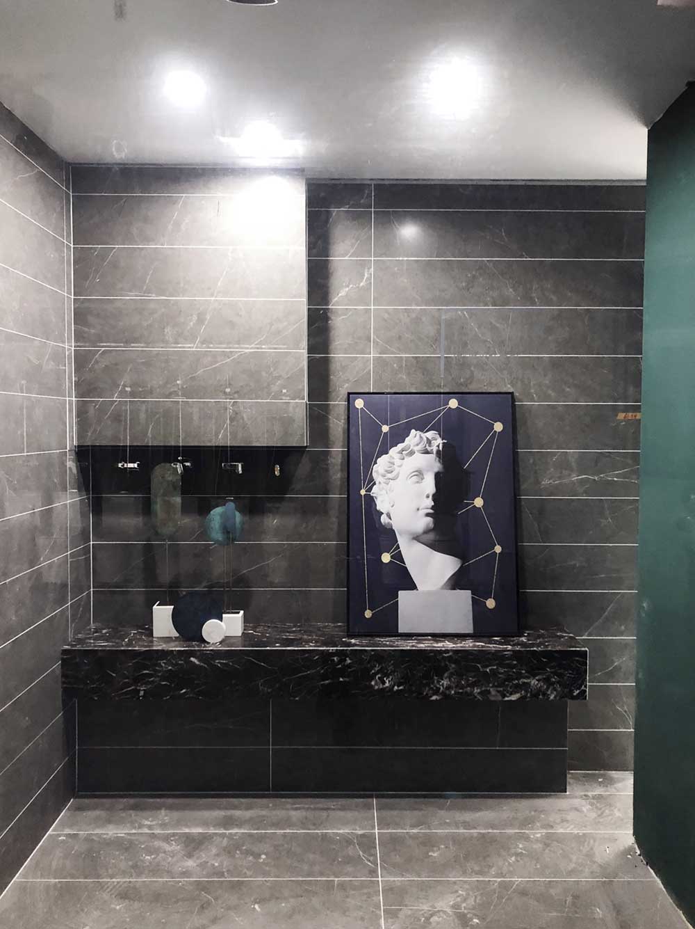 這是輕奢風格的衛(wèi)生間,區(qū)別于傳統(tǒng)衛(wèi)生間的鋪貼設(shè)計,選用的是九面通體大理石KA9M61205雅士白、KA9M61207閃電灰、KB9M61208卡門深灰,切割規(guī)格不一,個性又和諧,背景選用15°緞光釉KFD8808保加利亞灰,一深一淺的顏色碰撞出視覺沖擊,這種大膽的設(shè)計手法很受年輕消費者喜愛,融合了青春館創(chuàng)新、活力的品牌元素。這空間產(chǎn)品同樣適用于客廳地面、廚房墻面等。