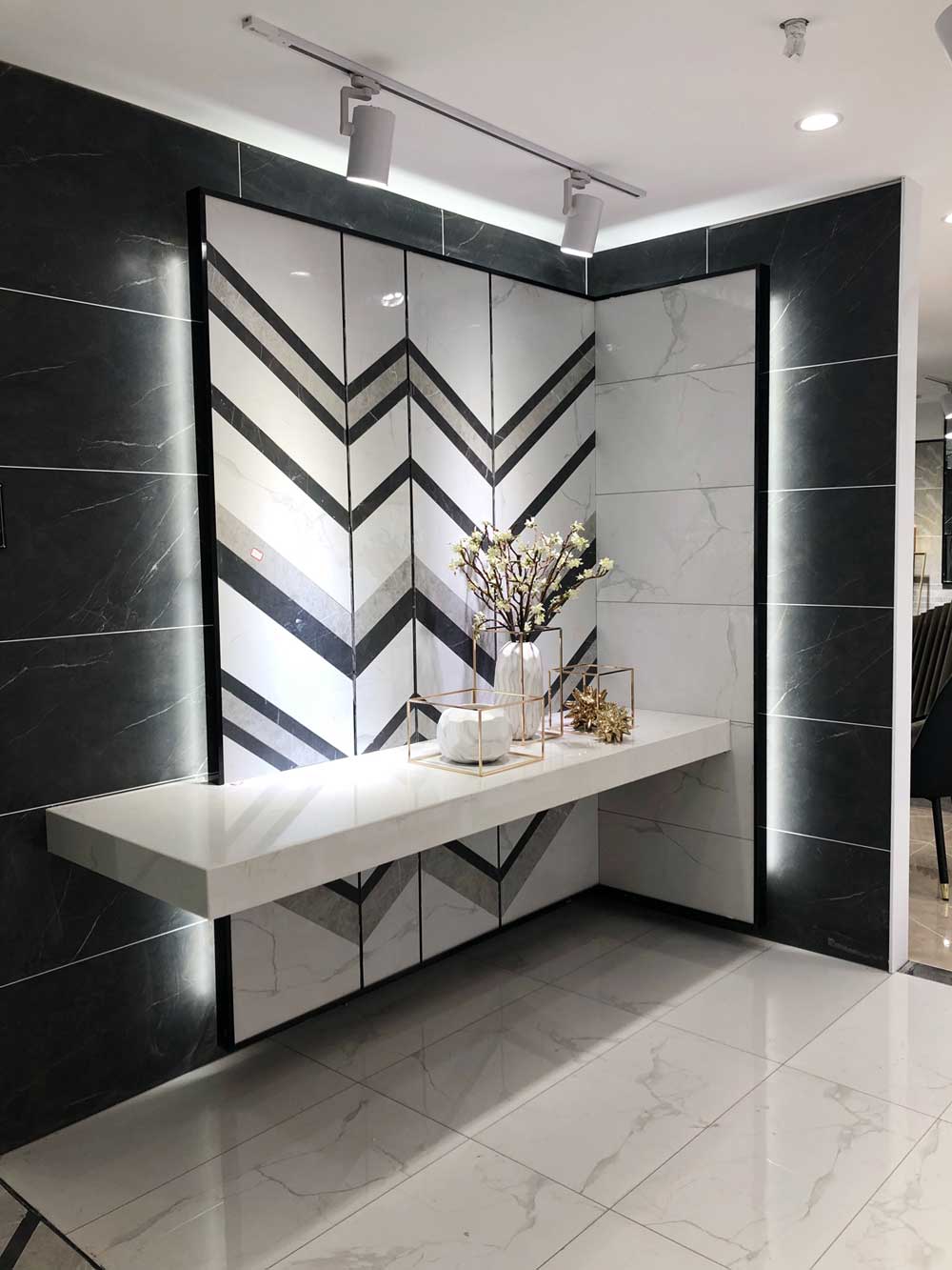 這是我們客廳電視背景墻的鋪貼效果,選用產(chǎn)品是九面通體大理石KA9M61213魚肚白和KA9M61209尼泊爾灰,大紋理與小紋理搭配出和諧、輕奢、簡潔的空間氛圍。這款產(chǎn)品還可以用作地面磚、廚房墻磚使用,適用范圍甚廣。