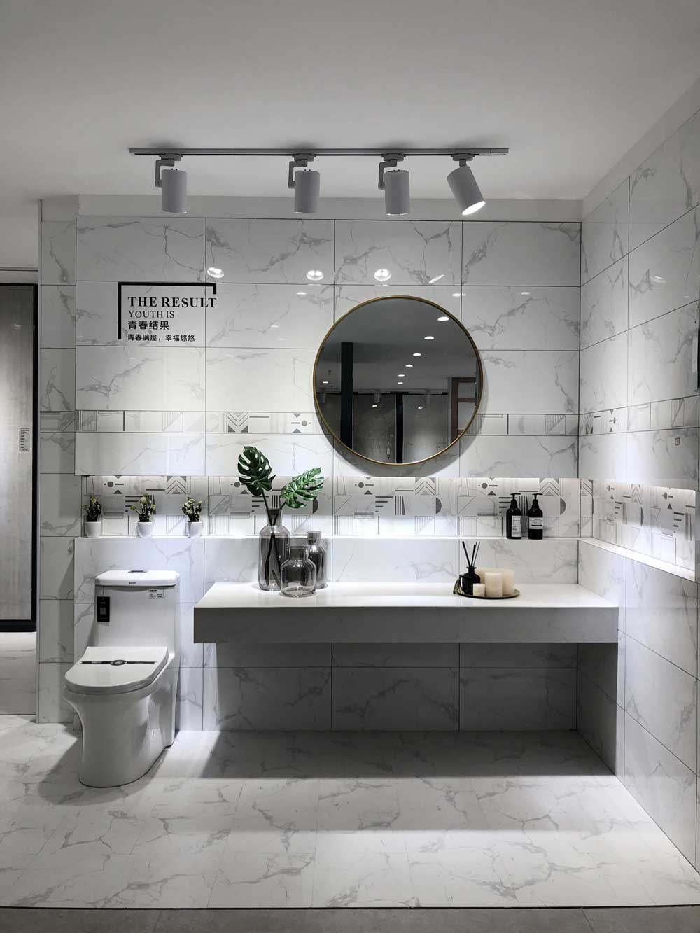 這個輕奢衛(wèi)生間選用的是噴墨瓷片KPM36088的配套產(chǎn)品,面積雖小,但看上去是不是挺寬闊明亮的?這就是白色磚的優(yōu)點,且衛(wèi)生間通常比較潮濕,選用白色磚給人潔凈明亮的感覺。使用感非常舒適。