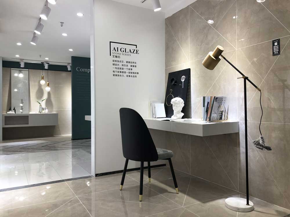 這是現(xiàn)代簡約書房的模擬間,鋪貼的是艾釉石KYP8118潘多拉灰,艾釉石是我們店里的明星產(chǎn)品,同行人都知道我們的磚釉面比別人亮,耐臟耐磨,因為我們有自己的釉料公司,自主研發(fā)釉料。再說灰色磚給人安靜的感覺,書房選灰色就沒錯了。