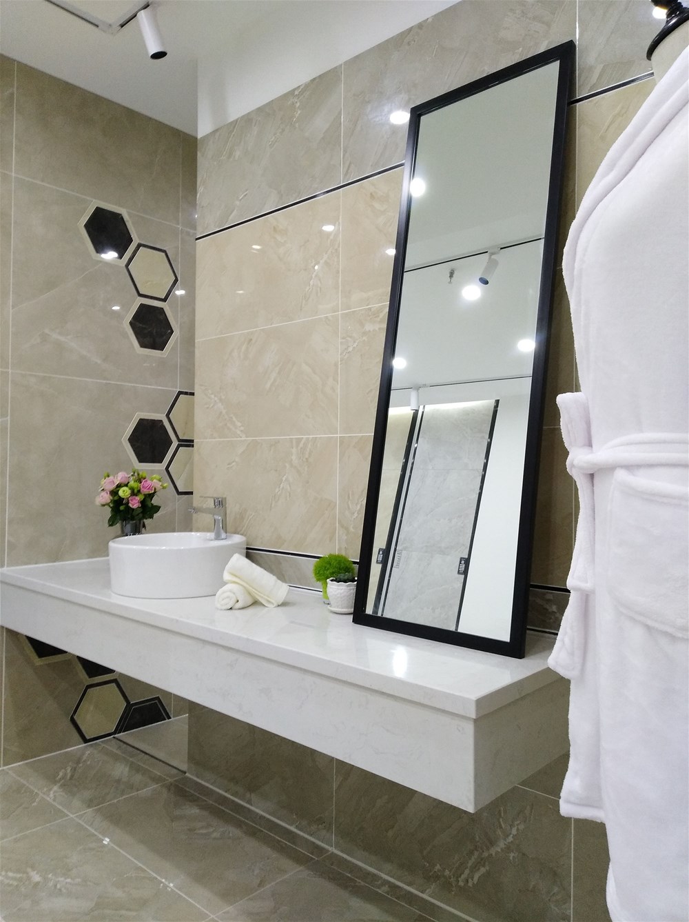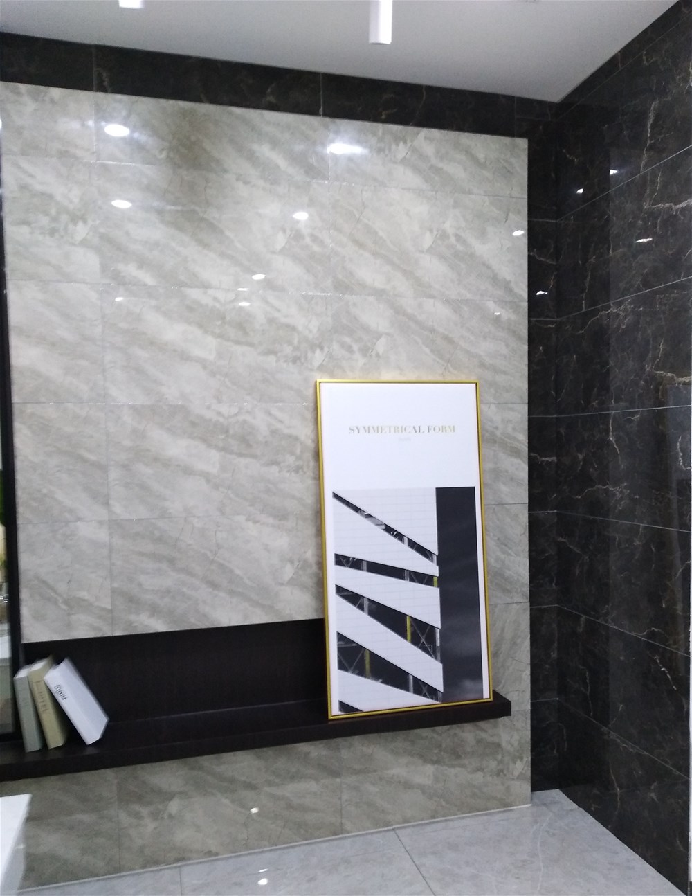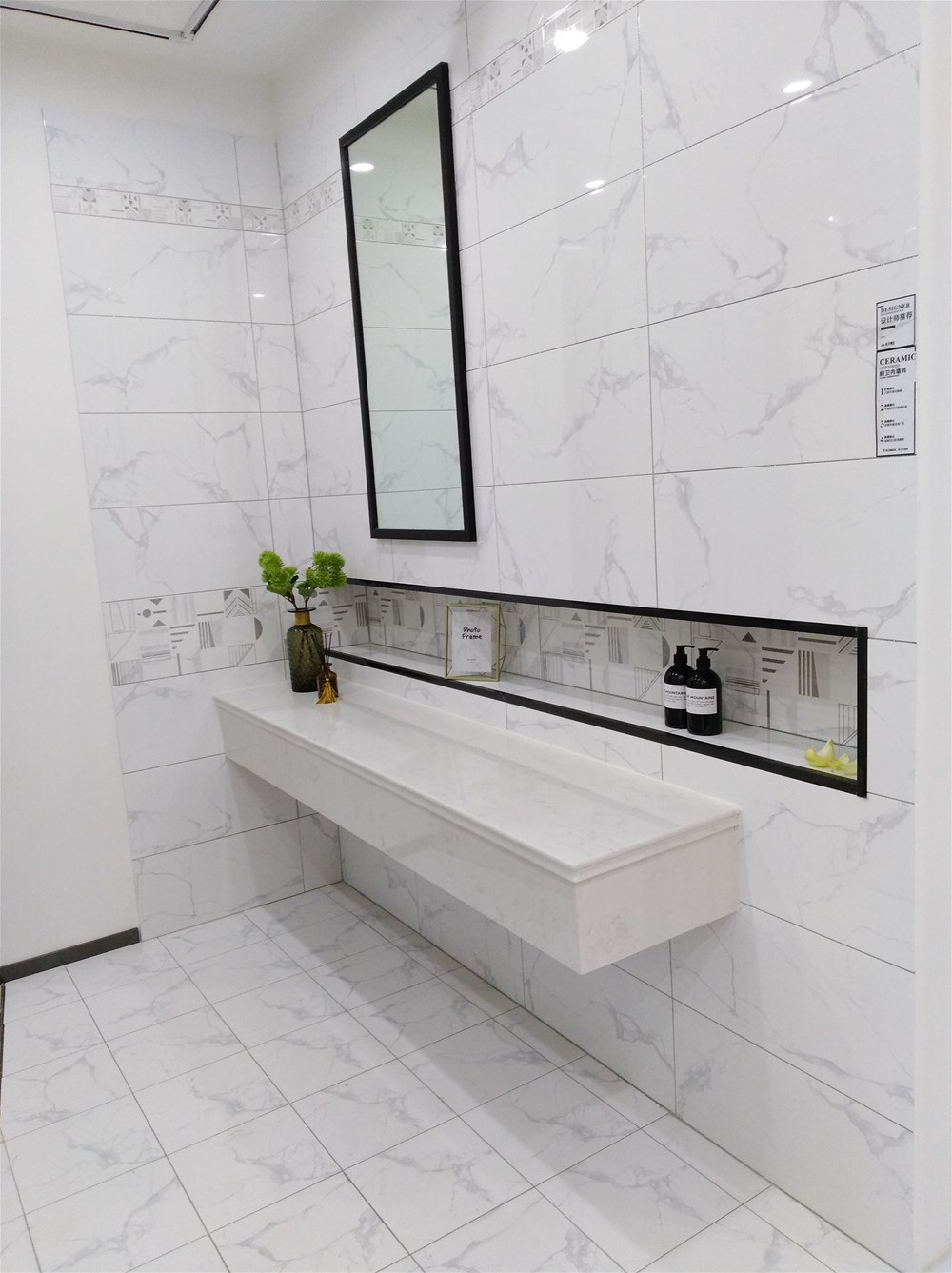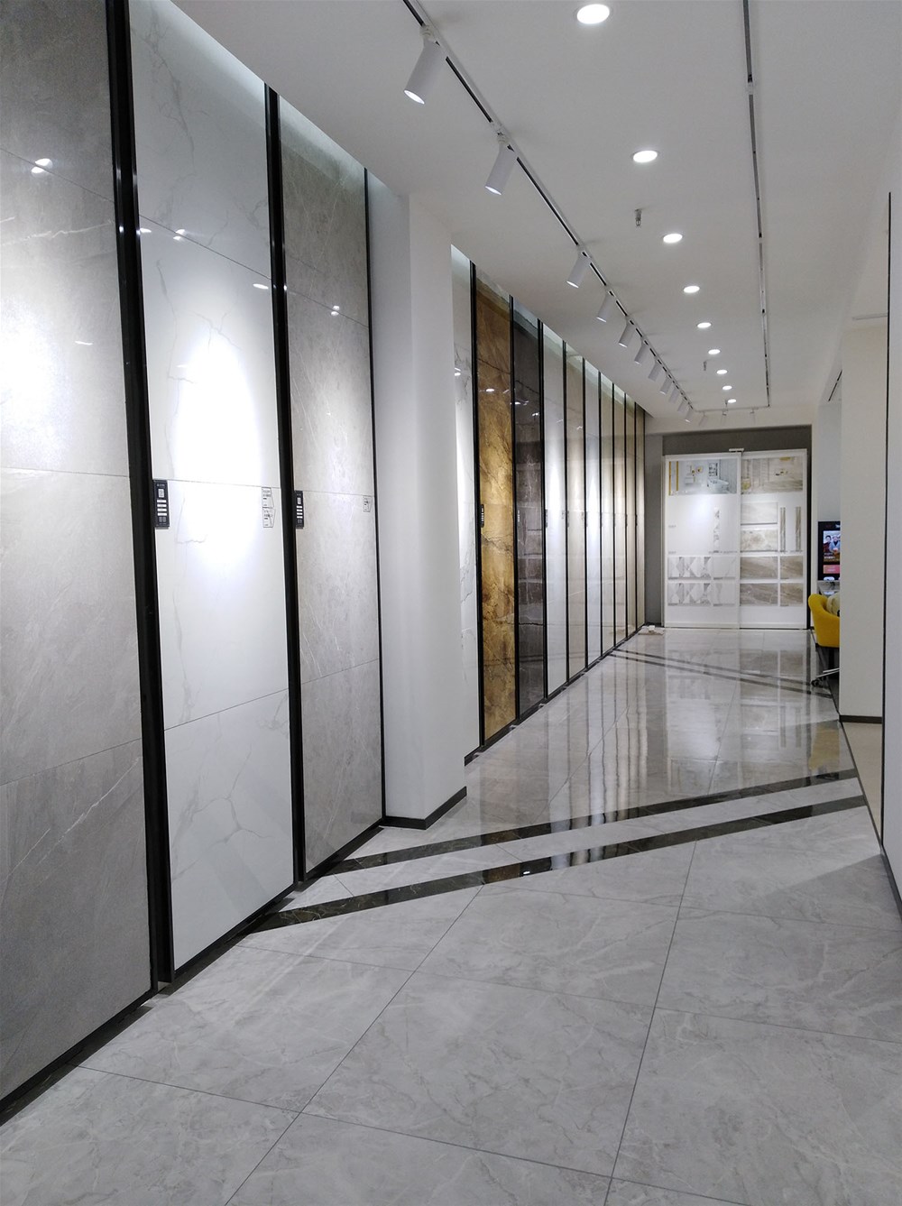這邊走,這是我們的選材區(qū),規(guī)格、款式、風(fēng)格一應(yīng)俱全,通過(guò)射燈照射下的磚面紋理是不是清晰多了?如果您現(xiàn)在還不知道自己要選什么產(chǎn)品,看完我們的模擬間你或許就能找到方向了。