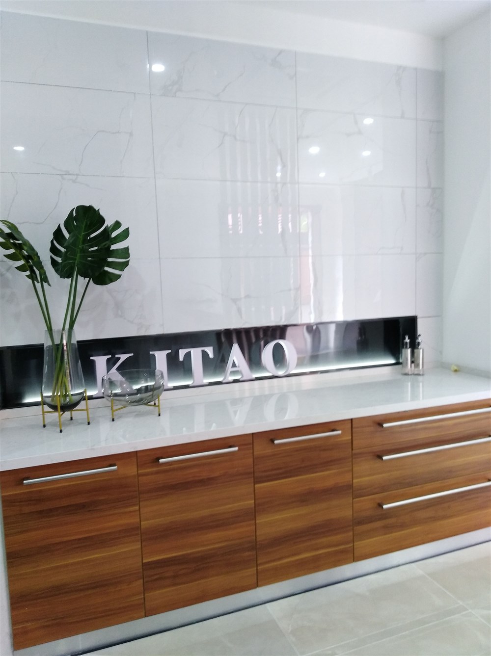 這是現(xiàn)代簡(jiǎn)約廚房模擬間,墻面選用九面通體大理石KA9M61205雅士白鋪貼,廚房我們會(huì)考慮到清潔問(wèn)題,選用亮面磚易于清潔,而選用白色是因?yàn)榘咨u讓空間看起來(lái)更寬敞明亮。