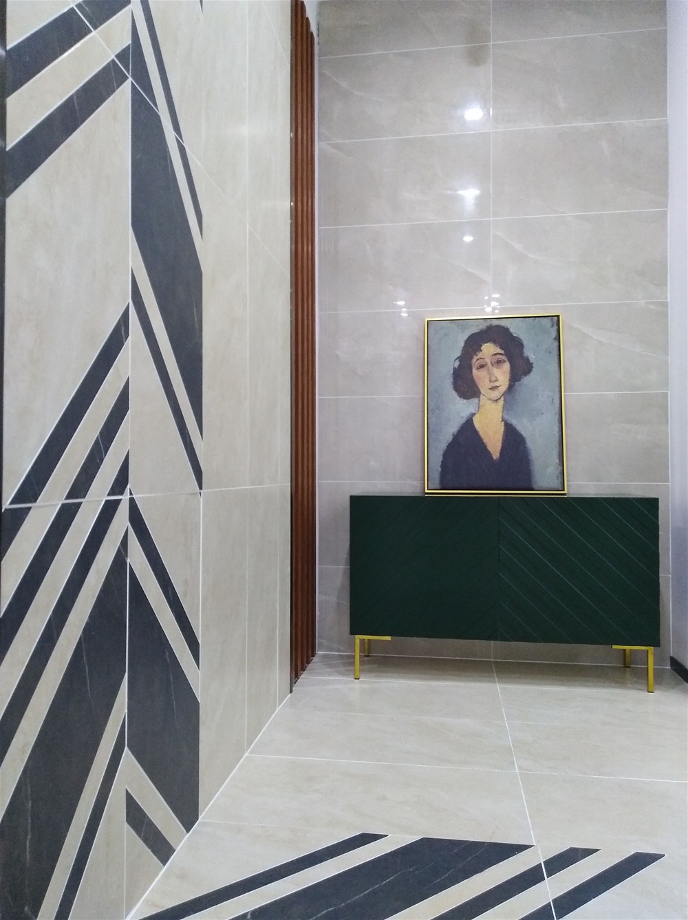 這是現(xiàn)代簡(jiǎn)約風(fēng)格玄關(guān),正面墻由通體大理石KT9832凱羅地灰鋪貼,玉石的質(zhì)感溫潤(rùn)細(xì)膩,側(cè)面墻則由15°緞光釉KFD8803泰坦米黃與KFD8808保級(jí)利亞灰切割鋪貼,正面正鋪與側(cè)面墻切割鋪貼,繁與簡(jiǎn)結(jié)合,亮面與柔光面搭配,不會(huì)造成視覺(jué)疲勞又不至于太單調(diào)。