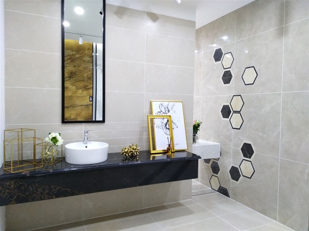 這就是我們公司配套的噴墨瓷片,也是我們店的明星產(chǎn)品,小地磚、花片、腰線一系列搭配,適用于廚衛(wèi)、陽(yáng)臺(tái)等區(qū)域,空間面積雖小,但是鋪設(shè)白色整體看起來(lái)就寬敞潔凈多了,磚面紋理大氣、自然、舒適,不知道您感受如何呢?很多年輕消費(fèi)者都非常喜歡我們這款產(chǎn)品呢!