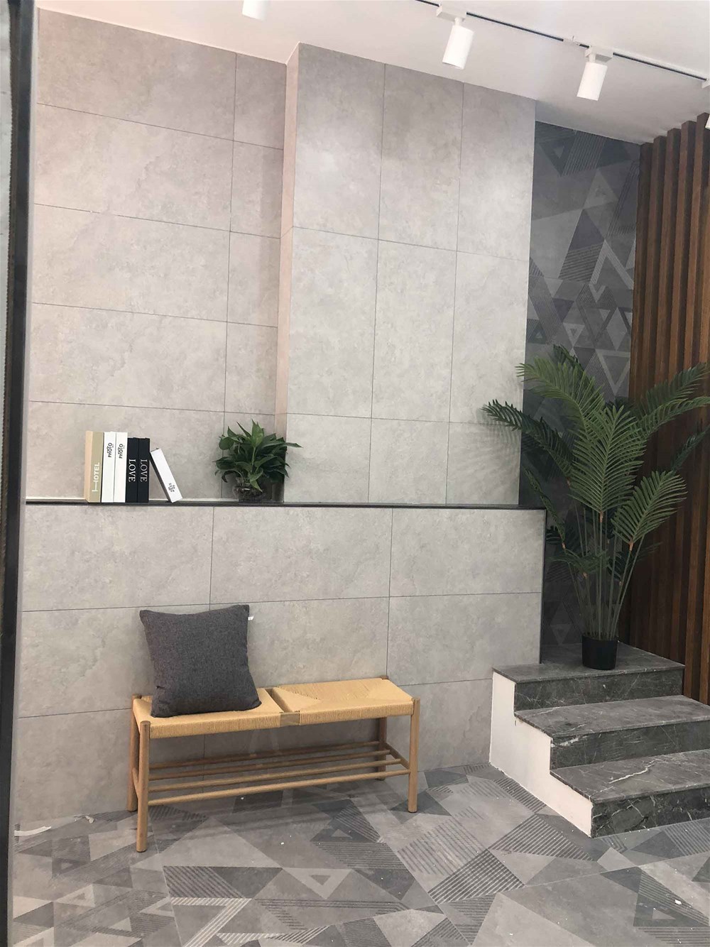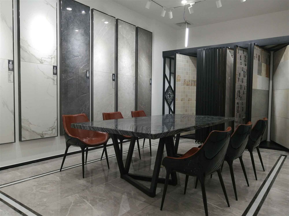 往里邊走,這是我們的選材區(qū),這里集合了200多個瓷磚花式,有通體大理石、15°緞光釉、噴墨瓷片、瓷拋磚、艾釉石、仿古磚等,噴墨瓷片都是配套產(chǎn)品,這邊拉開來就能直觀看到它的鋪貼效果。您再看,地面也是灰色瓷磚鋪貼的效果,您家客餐廳都適合這樣鋪設(shè)的。