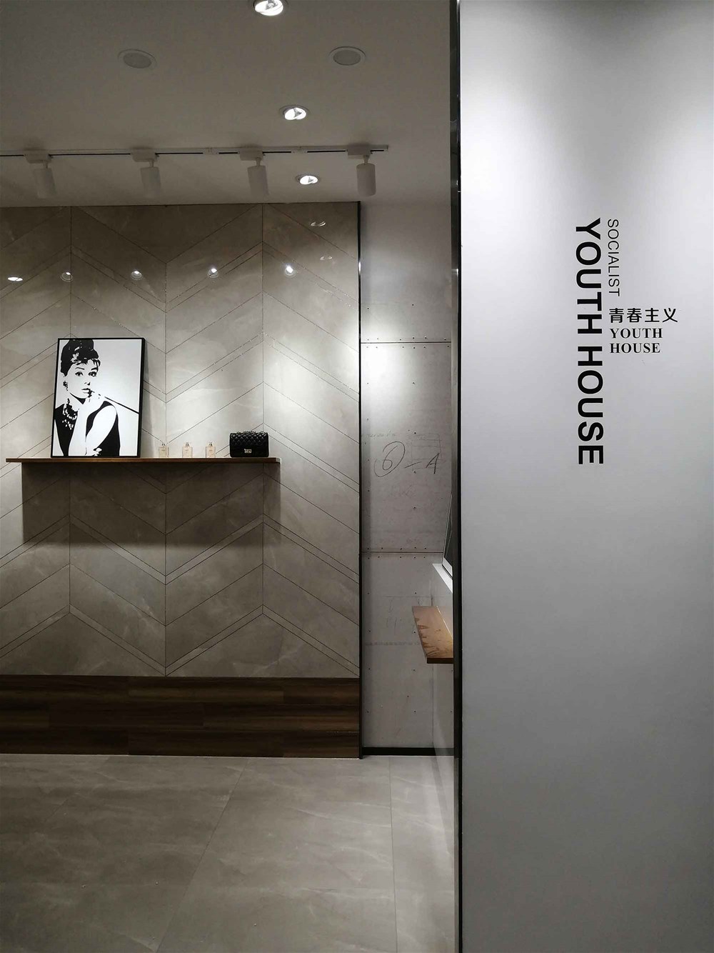 這是我們的前臺,logo背景墻選用九面通體大理石KA9M61209直鋪,灰色大紋理營造出簡約、優(yōu)雅、大氣的空間氛圍,家里客廳電視背景墻、地面同樣適用。這是近兩年家居裝修非常流行的顏色,不知道您喜不喜歡呢?