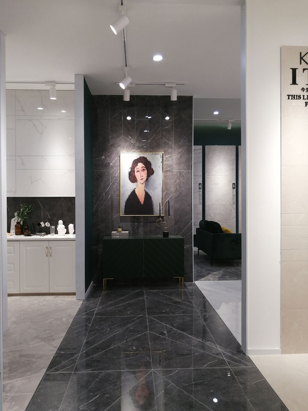 這是現(xiàn)代簡約過道,由通體大理石閃電灰KA9M61207鋪貼,整個(gè)過道以灰色調(diào)為主,墻面墨綠色的墻面點(diǎn)綴,讓過道富有張力,直鋪的方式延伸了整條過道的寬度和長度。有沒有想過您家過道用這款磚呢?躺著拍、站著拍、斜著拍,都沒問題!