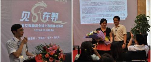 2013年6月25日,在金艾陶產(chǎn)品展廳,“見(jiàn)龍?jiān)谝?rdquo;——金艾陶新品全球上市新聞媒體見(jiàn)面會(huì)在金艾陶南莊華夏展廳順利舉行,正式對(duì)外宣告,金艾陶微晶石、艾釉石(健康超平釉)、瓷片、拋光磚等全系列產(chǎn)品全球上市。陶城報(bào)、陶瓷信息報(bào)、新浪、搜狐、鳳凰網(wǎng)、中國(guó)陶瓷網(wǎng)、陶瓷資訊、建材周刊、今日陶瓷、華夏陶瓷網(wǎng)等新聞媒體的朋友,一起匯聚在金艾陶產(chǎn)品展廳,探尋金艾陶瓷磚品牌背后神秘的故事。