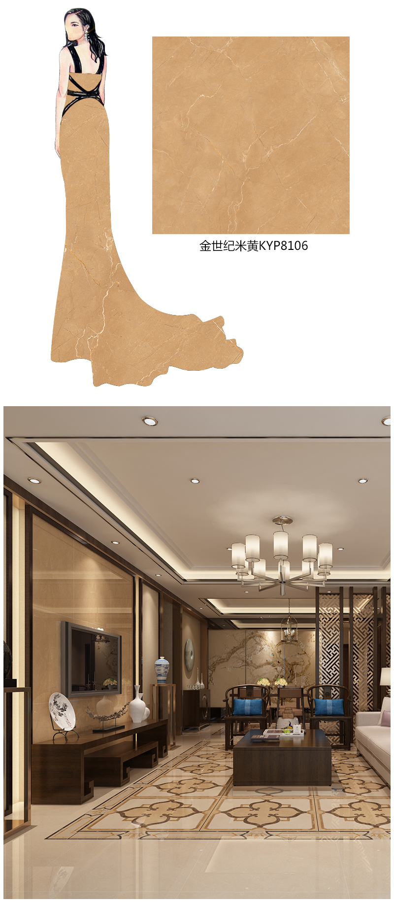 金艾陶金世紀(jì)米黃由黃色底紋與白色、金褐色線條組成逼真柔和且極高層次感的線條紋理。完美呈現(xiàn)金世紀(jì)米黃的流動(dòng)質(zhì)感,如月光下的冰山般輕盈通透又獨(dú)具詩般的厚重。