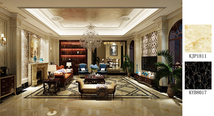生活美學(xué)是自然而然的流露,客廳的每一處都透著浪漫與時(shí)尚。地面主要鋪貼金剛釉瓷磚香檳玉KJP1811,搭配大理石瓷磚黑金花KYB8017,唯美典雅,讓家成為人們心中最溫馨的港灣。