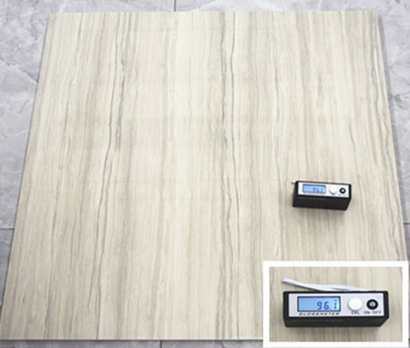 測(cè)評(píng)瓷磚必不可少的一項(xiàng)環(huán)節(jié)就是光澤度的測(cè)試,測(cè)評(píng)人員使用專業(yè)的光澤度儀,在瓷磚表面移動(dòng)不同的位置測(cè)試,最后結(jié)果為多個(gè)位置光澤度的平均值。測(cè)試結(jié)果為96.1度,光澤度可以說(shuō)是讓人意想不到的好。