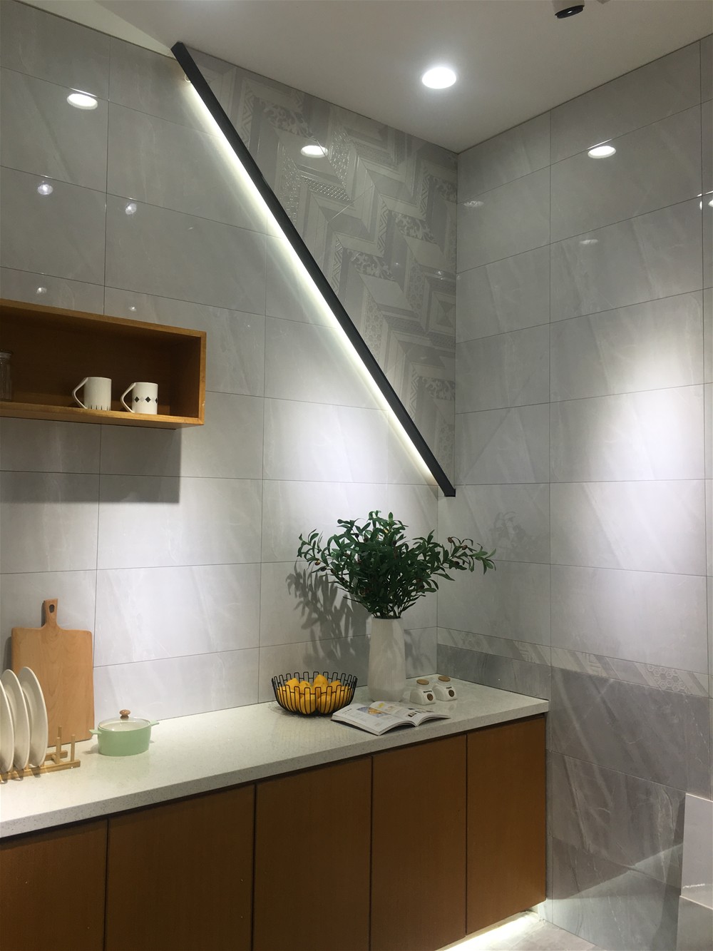 廚房:不飽和的灰色調(diào)搭配不傳統(tǒng)的燈光裝飾,臺(tái)上有綠色植物的點(diǎn)綴,主人又怎么會(huì)不愛(ài)好烹飪呢?